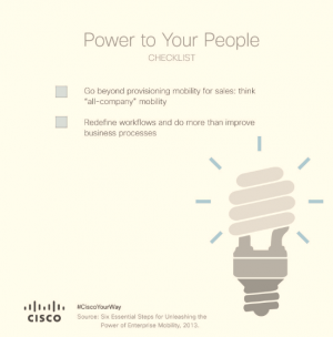 Over the course of this series, we've discussed how enterprises can better enable people to work in their own way, regardless of where they are and what device they are using. We started by making smart plans at an architecture level and then implementing secure policies along the way. The final step enterprises need to take may be the hardest one of all but can yield the greatest results. To increase productivity, business agility, and customer satisfaction, enterprises must actively embrace mobility in the workplace. Here's a short checklist to help organizations with this last step: