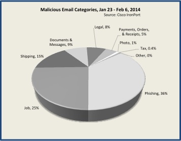 At 36%, phishing scams employing malicious attachments also factored significantly over the past two weeks, mainly due to an outbreak beginning Feb 4th. This increase was significant enough to affect overall volume of malicious email, as seen in the chart below.