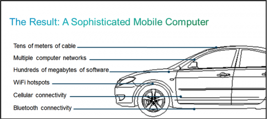 Like everything else in the forthcoming Internet of Everything era, cars, which today already rely heavily on digitized systems, are well on their way to connectivity with their surroundings. This is a welcome development. Already we have Bluetooth (radio to cellular) to help us speak hands-free while driving and GPS to keep from getting lost. In the near future, two communicative cars on a collision course could take preventative measures to avoid a crash. So the future looks bright. Our cars are essentially mobile computers on wheels, and our driving experience will be richer and safer as a result.
