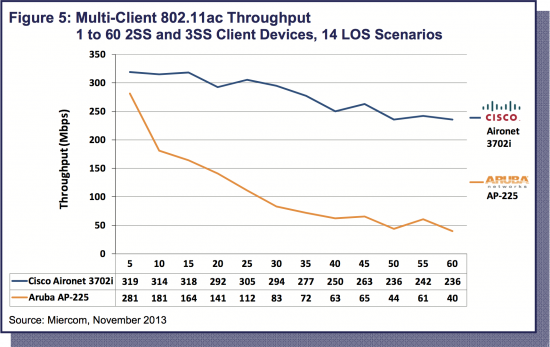 Let's take a look at how the competition handled the transition to 802.11ac. Miercom recently published a report that put the Cisco AP 3700 head-to-head with the Aruba AP-225. As you can see, the Aruba architecture does not handle increasing numbers of clients very well. The chart shows performance as clients are added, starting with 5 clients and scaling to 60 clients.