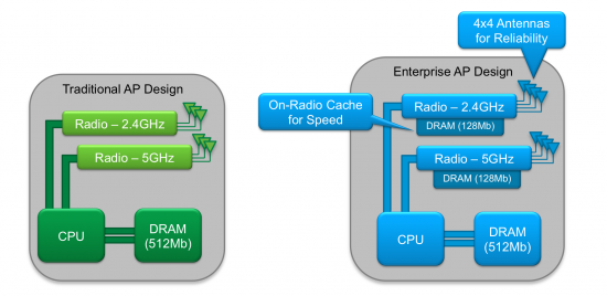 This graphic shows the traditional AP design versus Enterprise AP design, which we used in the AP3700. In the traditional AP the RAM is placed close to the host CPU, instead of the radios. With the increased speeds of 802.11ac, it's important to have a design like the Enterprise AP 3700, where RAM is placed on the CPU and directly on the radios.