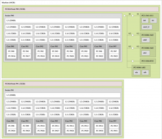 Figure 2 shows the system topology of a single server of Mellanox's R&D system, "Sputnik", which consists of two Sandy-Bridge NUMA servers. Each NUMA node has eight physical cores with two hyperthreads per core. We are able to clearly see that this system has a single Mellanox Connect-IB HCA, mlx5_0, attached to socket P#0. Launching an MPI application with the following command: