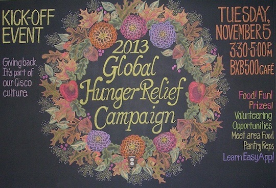 This year, Cisco employees in Lawrenceville, Georgia, Research Triangle Park (RTP), North Carolina, and at the Kanata R&D site in Ottawa, Ontario, Canada, created cansculptures, while a chalkboard artist in Boxborough, Massachusetts created a Global Hunger Relief chalk wall in the cafe.