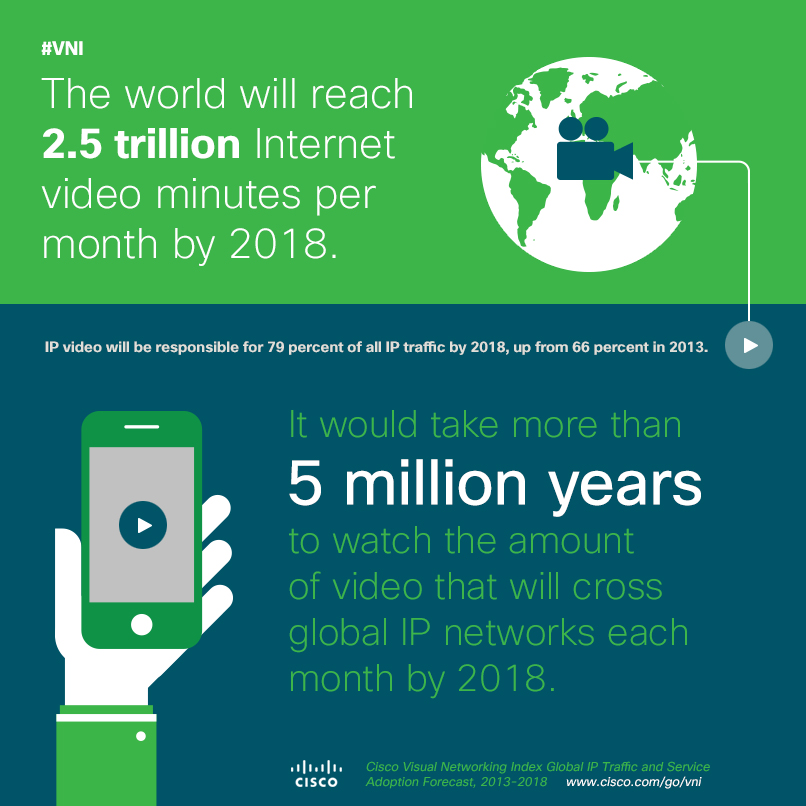 The world will reach 2.5 trillion Internet video minutes per month by 2018. That is nearly 5 million years of video per month, or 1 million video minutes every second, or nearly two years' worth (657 days) of video every second.