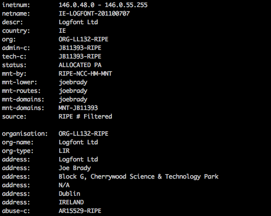Talos' investigation showed that the IP 146.0.53.17 is legitimately allocated to an organization named "Logfont Ltd" located in Dublin, Ireland, operating under Autonomous System (AS) AS51677.