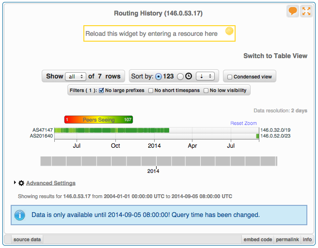 If we look at historical Border Gateway Protocol (BGP) announcements for the IP 146.0.53.17 we see something quite interesting. Two different foreign Autonomous Systems (AS) have announced two unique BGP prefixes, 146.0.32.0/19 by AS47147 and 146.0.52.0/23 by AS201640, that IP address 146.0.53.17 falls within. Strikingly, we can also see a huge gap where no BGP prefixes were announced that this IP address is associated with.
