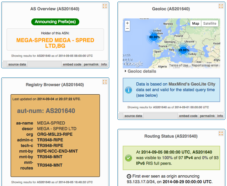 The other AS, the rogue AS who hijacked the IP space, is AS201640 which belongs to MEGA-SPRED, an Autonomous System registered in Bulgaria.