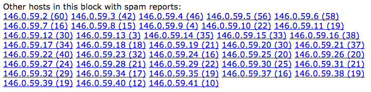 This domain was registered under the name "Mike Prescott" which is probably a pretty common name, however the email address [email protected] is much more likely to be under the direct control of the attackers. What other domains has the email address [email protected] registered? According to DomainTools, this email address is responsible for registering 45 domains. A quick check into the domains, and associated spam shows that these domains have been deployed as part of the same IP hijacking campaign, but using different IP addresses from the same hijacked netblock. SpamCop also confirms this is the case.