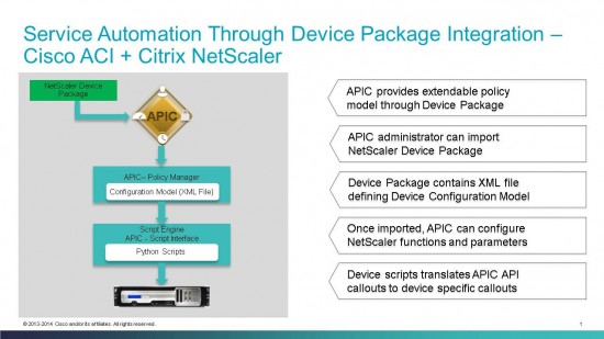 The Citrix NetScaler Device Package for Cisco ACI comprises a device Model and a device Script. The device Model defines the functions provided by NetScaler SDX/VPX/MPX such as load-balancing, content switching etc., The device Script provides the adapter functions required for NetScaler to communicate with APIC.