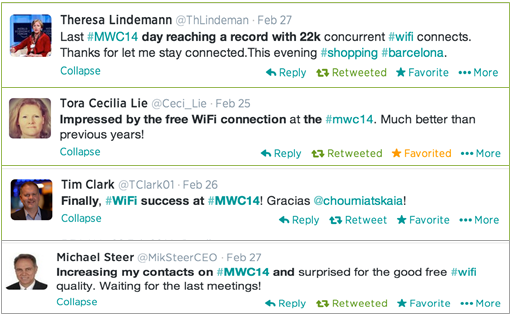 Check out some more twitter reactions and get a technical deep dive on how Cisco optimized the wireless network at MWC: Mobile World Congress 2014 -Behind the Wi-Fi Network whitepaper covers all the techniques for building a solid high density Wi-Fi network including RX-SOP, Beamforming, and Radio Resource Management. The next blog in this series will highlight the HotSpot 2.0 deployment at MWC.