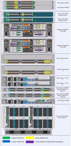 Mike and I had a chat about his connections to other data center resources and the mix of software solutions that powers his business. The takeaway was that the FlexPod is now his natural choice. The beauty of the convergence is as Mike described, every component was what he'd choose and little things like cabling design was documented well so that he'd not make little mistakes that could cause availability issues in his data center. Mike is right, check out the figure to the left from a Cisco Validated Design.