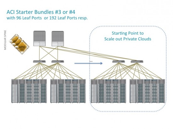 ACI Starter Bundles #3 or #4 can be used as a starting point to scale out private clouds with secure multi-tenancy since they are based upon the more expandable modular chassis. (Fig. 4)
