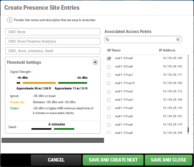 Presence Analytics is very simple to configure by naming the entry, selecting the access point, and setting threshold values. Best of all, the majority of CMX Analytics reports are available automatically. All this allows customers to start using CMX Analytics without having to make any changes to their existing network and get immediate value from it.