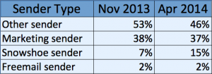 Every so often, we observe certain spam campaigns that catch our interest. On August 15, we observed a particular spam campaign that caught our attention because it was using "snowshoe" spam techniques combined with PDF exploitation. While neither of these techniques are new, we have seen a growing trend involving snowshoe spam and we wanted to explain why the bad guys seem to be moving in that direction with a real world example. As you can see from the chart below, we've seen the amount of snowshoe spam double since November of 2013.