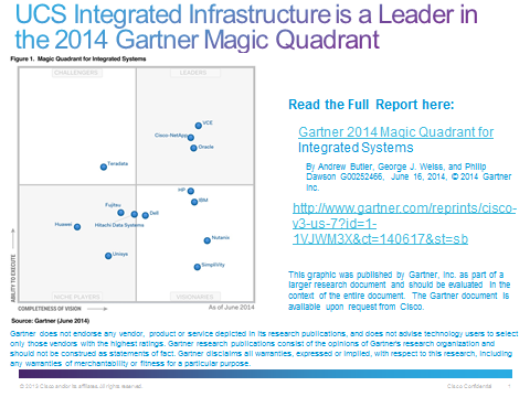 The integrated infrastructure segment continues to be one of the fastest growing IT markets. I recently highlighted that Cisco was the leader in the integrated infrastructure market with leading integrated systems built on top of UCS integrated infrastructure (Cisco UCS, Cisco Nexus, and UCS Director). In fact, in Gartner's inaugural Magic Quadrant report for integrated systems, integrated systems based on UCS integrated infrastructure have been rated in the Leaders Quadrant. In addition, IDC just released their Q1 2014 Worldwide Quarterly Integrated Infrastructure and Platforms Tracker with UCS integrated infrastructure participating in the top three integrated infrastructure solutions. These results show that innovation and solving customer pain points is still a solid formula for success.