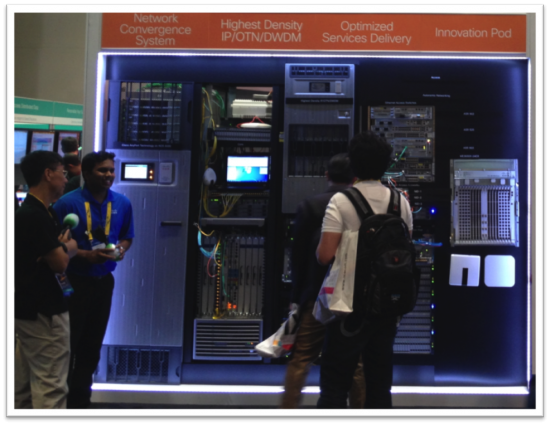 Our ambition to build and turn on an end-to-end network at the event became a success. The entire family of the routing and switching portfolio was showcased at the SP booth. For this event we had set up an NCS 6000 (core), ASR 9000 (edge), access (ASR 901, ASR 903, ME3800X ME1200), and the Innovation Pod -all connected to form an end-to-end EPN network.