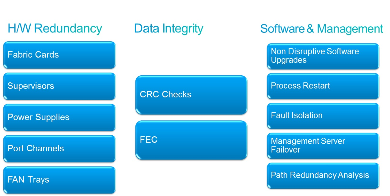 MDS 9710 is the only director in the industry that provides Hardware Redundancy on all critical components of the switch, including fabric cards. Cisco Director Switches provide not only CRC checks but ability to drop corrupted frames. Without that ability network infrastructure exposes the end devices to the corrupted frames. Having ability to drop the CRC frames and quickly isolate the failing links outside as well as inside of the director provides Data Integrity and fault resiliency. VSAN allows fault isolation, Port Channel provides smaller failure domains, DCNM provides rich feature set for higher availability and redundancy. All of these are but a subset of examples which provides high resiliency and reliability.