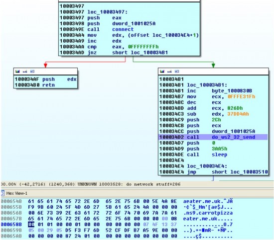The embedded Silverlight exploit uses a custom IntPtr handle above (which gets called in agcore.dll) to achieve code execution. The dropped malware starts listening on ports 14099 and 20231, decrypts "C:\Documents and Settings\<user>\Local\Settings\Application Data\extrics.dll" and then calls loadlibrary on it. Extrics.dll uses ws2_32.dll (Winsock) to establish a TCP session with the hard coded address, ns9.carrotpizzaeater.me.uk.