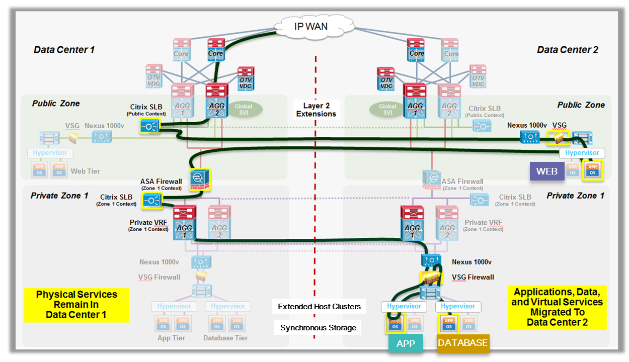 - Layer 2 Extensions permit tromboning back to Data Center 1 to maintain connections to physical appliances (stateful firewalls and load balancers), also without manual intervention.