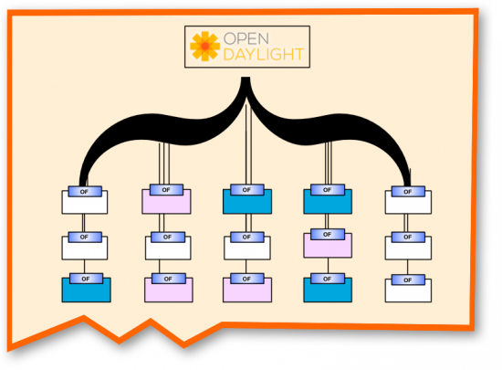 "If I understand this, then," I said, "This OpenDaylight controller talks with OpenFlow in order to get these different switches to do what you want."