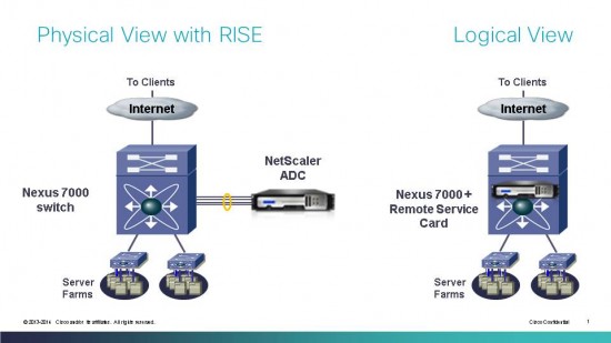 - Reduced Total cost of Ownership (TCO): Fully integrated with Nexus 7000 switches, RISE fosters simplified manageability, automated operation and increased utilization of application delivery resources.