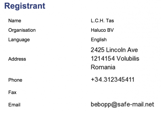 One interesting, almost anomalous aspect related to the throwaway domains registered in the .eu ccTLD is the apparent appropriation of another company's corporate identity in the domain registrations. All the .eu throwaway redirector domains seem to be registered to the same registrant organization: Haluco BV -a legitimate fruit and vegetable vendor from the Netherlands. However, these throwaway malvertising redirection .eu domains don't appear to be in any way related to the real Haluco BV corporation. In fact, the address for the throwaway domains can be found in the country of Romania on a road named "Lincoln Ave". You may be shocked to find out this address does not actually exist.