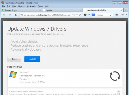 In a subsequent blog post published June 15, 2014 by Kimberly at Stop Malvertising, malicious ads using this same malvertising network were found to be redirecting visitors to sites propagating the "Optimum Installer". Included were fake warnings to "Update your Media Player", and "Update Windows 7 Drivers". Again, please note the presence of the same "sov=" and "hid=" parameters in the URL query string.