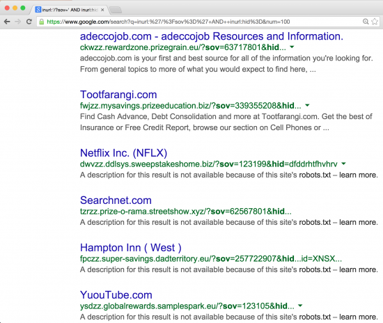 Throwaway domains and the use of "sov=" and "hid=" URL parameters. Note the inconsistent use of a robots.txt file to prevent indexing by search engines.