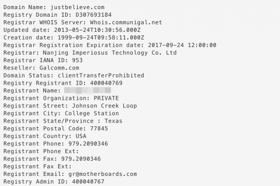 The domain "justbelieve.com" is currently WHOIS privacy protected, but it wasn't always this way. The domain was also the subject of some recent Uniform Domain Name Resolution Policy (UDRP) proceedings. According to both the archived WHOIS record that appears below, and the March 2014 UDRP, the domain was registered at the Nanjing Imperiosus registrar using the email address [email protected].