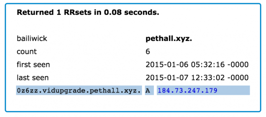 Of course, in order to truly hide, the Amazon EC2 instance's public IP address ought to be changed every so often. Fortunately, it seems our malvertising infrastructure operator has failed to do this regularly. For example, redirection domains matching our "sov=" and "hid=" URL query string patterns appeared throughout 2014 on the Amazon EC2 IP address 184.73.247.179. Talos was able to confirm that this particular IP was associated with the same virtual machine instance for the majority of 2014 and 2015. Whomever is controlling that IP address is also most likely controlling the anonymous malvertising redirection network.