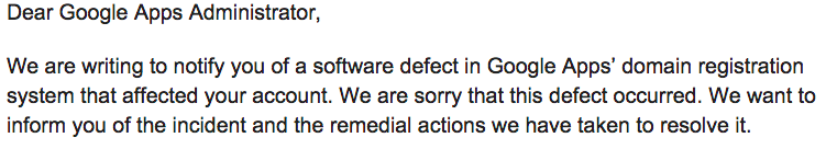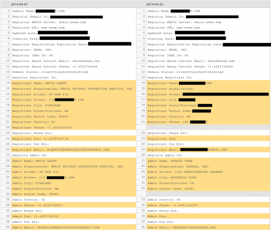 In mid-2013, a problem occurred that slowly began unmasking the hidden registration information for owners' domains that had opted into WHOIS privacy protection. These domains all appear to be registered via Google App [1], using eNom as a registrar. At the time of writing this blog, there are 305,925 domains registered via Google's partnership with eNom. 282,867 domains, or roughly 94% appear have been affected [2]. (Google reports that new domains which have not faced a renewal period are not affected and many businesses do not opt into their privacy service.) The information disclosed included full names, addresses, phone numbers, and email addresses for each domain. The information was leaked in the form of WHOIS records.