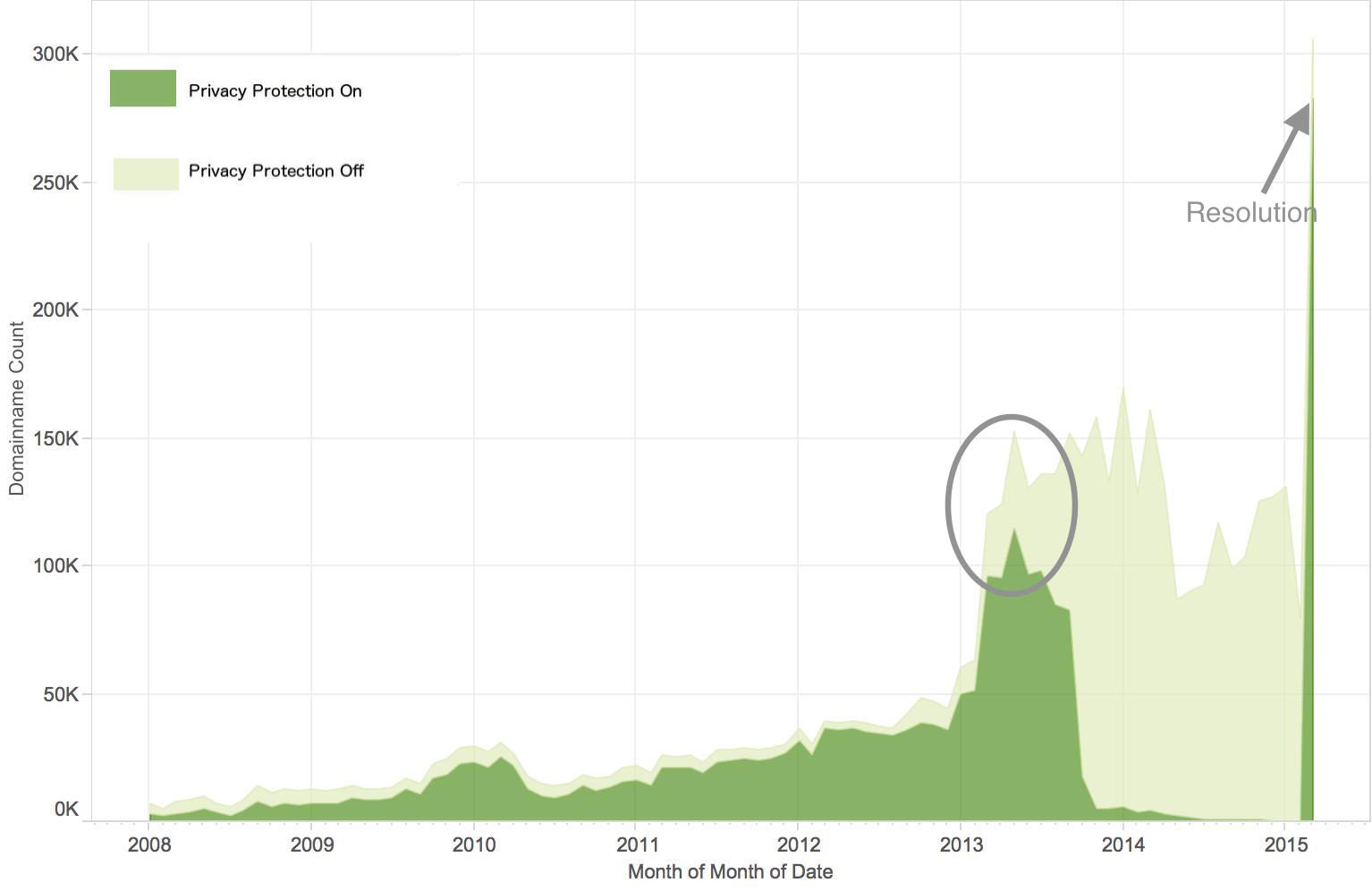 The graphic above illustrates the drastic shift in domains utilizing privacy protection (dark green) to those with WHOIS information exposed (light green). At its peak at least 90% of the domains registered were utilizing privacy protection which plummeted to less than 1%. The grey circle indicates the initial shift occurring. The arrow notes when resolution had occurred.