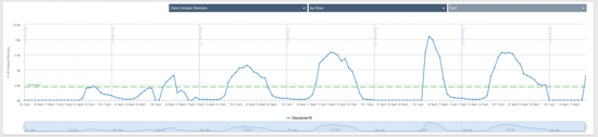 Beyond the fundamental data of total visitors, this information can be shown broken down by building, floor, or zone. Figure 2 shows the number of devices detected throughout the entire week, broken down by zone.