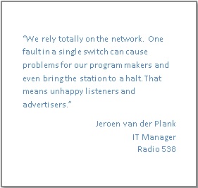 Radio 538, a 24×7 broadcaster in the Netherlands, chose Cisco Business Edition 6000 as part of its network solution. Radio 538 needed to quickly deploy a robust and reliable communications platform that could handle large call volumes for their live talk shows, provide unified communications services to 160 employees, and keep broadcasting as it moved into a new state-of the-art facility.