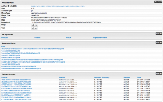 Each Object Stream is now considered an Artifact and so becomes a pivot point for further search and correlation. Drilling down into one of the Artifacts, a JavaScript Object, we can see the metadata, AV Signatures, Associated Paths, and Related Samples. The Related Samples table displays samples and artifacts that have been seen in the AMP Threat Grid database. This feature allows AMP Threat Grid to correlate samples that share shellcode, JavaScript, and other similarities.