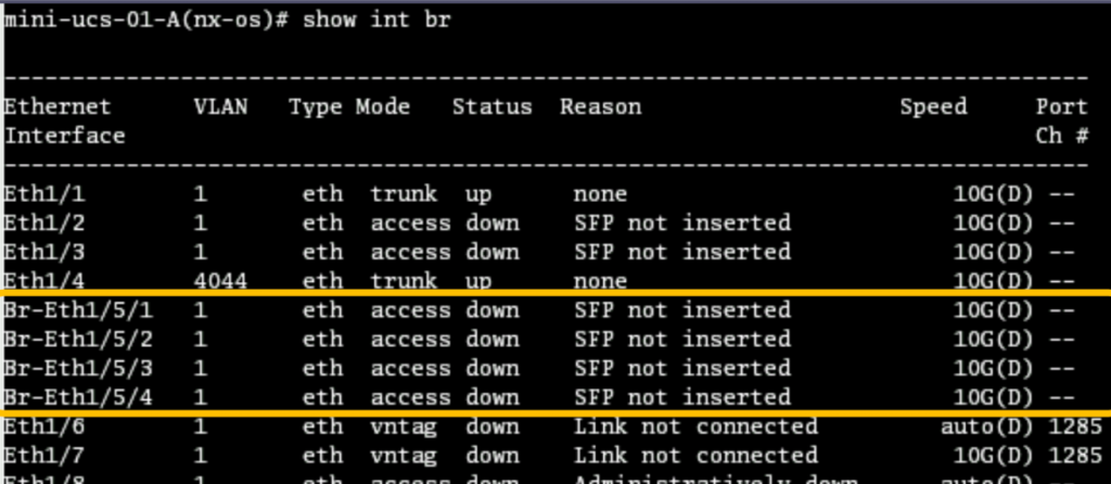 The fixed 10Gbps ports can be used as Server, Uplink and FC/FCoE Storage ports. The 40Gbps QSFP+ breakout port can only be used as Server, Appliance and FCoE Storage ports. Breakout scalability ports are named as Br-Eth1/5/1 to Br-Eth1/5/4: