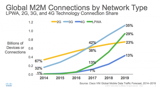 This year's forecast includes M2M nodes connected via Low-Power, Wide-Area (LPWA) networks. These networks are opening new M2M use cases by delivering an optimized ultra-narrowband solution that can support a wide area of coverage with minimal power consumption and connectivity costs. LPWA solutions are opening a host of new Internet of Everything (IoE) use cases for mobile network operators (MNOs) that could not have been addressed by cellular networks alone (early adoption has been seen in the healthcare and utilities industries). In the context of total global mobile devices and connections, the share of LPWA connections (all M2M) will grow from less than a tenth of a percent in 2014 (less than 1 million connections) to 8 percent by 2019 (933 million connections). When viewed strictly from a global M2M mobile connection perspective, the impact of LPWA is even more significant (see below).