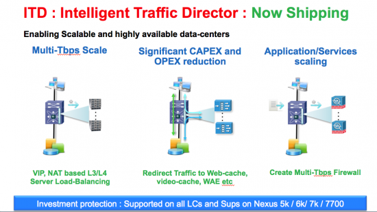 It allows customers to deploy servers and appliances from any vendor with no network or topology changes. With a few simple configuration steps on a Cisco Nexus® 7000/7700 series switch, customers can create an appliance or server cluster and deploy multiple devices to scale service capacity with ease. The servers or appliances do not have to be directly connected to the Cisco Nexus switch. ITD started shipping in NX-OS 6.2(8) and has significant new features in 6.2(10).