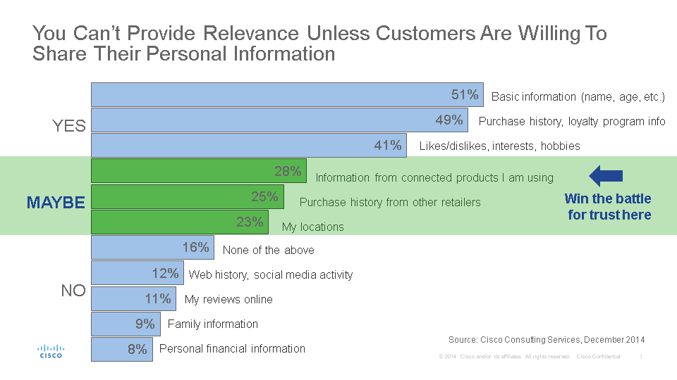 Retail competitive dynamics in the next five years will be governed by who wins permission from consumers to leverage the data at the middle of the trust cliff. This data will be the lifeblood of the Internet-of-Everything-enabled solutions - such as proximity marketing, targeted promotions, and in-store analytics - that will ultimately deliver hyper-relevance to consumers, while making retailers more profitable.