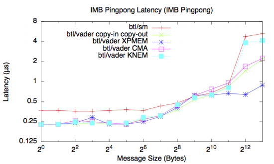 The following graph shows the latency of Vader's different mechanisms vs. the old "sm" BTL: