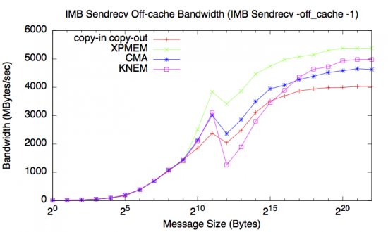 As expected, all three single-copy mechanisms provide better large message bandwidth than the CICO approach, particularly at large message sizes. Of the three single-copy methods, XPMEM is the clear bandwidth winner with this benchmark, due to a combination of lower overhead from fewer system calls and faster user-space memcpy routines.