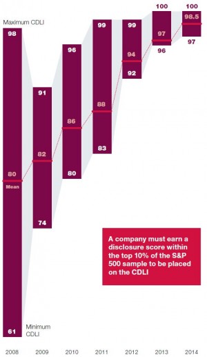 On September 23, CDP released the results of its regional assessments. In Cisco's case, CDP reported our scoring as part of its U.S.-based S&P 500 report. For the 2nd year in a row, we received the top score of 100. Another accomplishment that I think is especially meaningful is that we made CDP's Carbon Disclosure Leadership index (CDLI) for the 7th year in a row. As companies have improved their reporting, disclosure scores have improved; the "room at the top" is a lot smaller (see CDP chart below).
