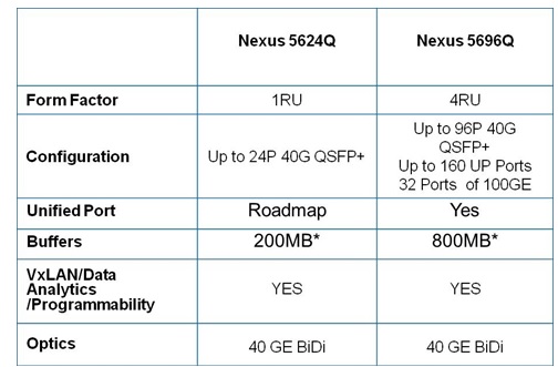 The Cisco 5600 series provide a low entry point for customers who wish to incrementally transition to 40G without sacrificing performance. The New 5624Q provides a minimum of 12 ports of 40 GE and scale up to 96 ports of 40 GE using Nexus 5696Q.