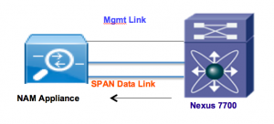 - Direct Attach mode with single NAM: The appliance has a management link that is directly attached to the Nexus switch. Up to 4 data links on the NAM can be attached to one or more VDCs on the Nexus switch to send SPAN traffic (Figure 2).