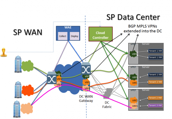 Khaddam distinguishes between infrastructure-based SDN (such as WAE) and virtualization SDN for managing multiple tenants and applications in a data center. An example of the latter, diagramed here, forms the basis for some of the virtualized managed business services we announced on September 29.