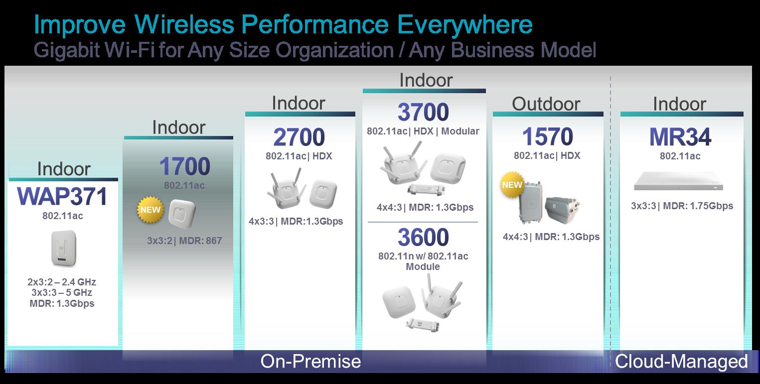 Whether you require a robust highest performing 802.11ac solution or you just need something for your small to medium sized business, Cisco offers the industry's broadest 802.11ac portfolio. With the recent introduction of the new Aironet 1700 Series indoor AP that is designed to meet the growing needs of today's small and medium-sized, wireless, enterprise networks. Also just released is the Aironet 1570 Series Outdoor AP. The Aironet 1570 is the industry's highest-performing outdoor access point and delivers a robust mobility experience to outdoor deployments, supporting 802.11ac, optimized roaming and cellular handoff, and Cisco High Density Experience (HDX).