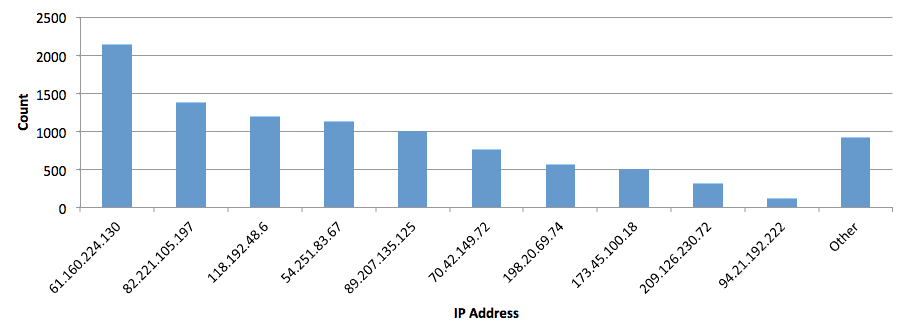 Examining our data in more detail shows that the majority of attacks originate from a handful of IP addresses: