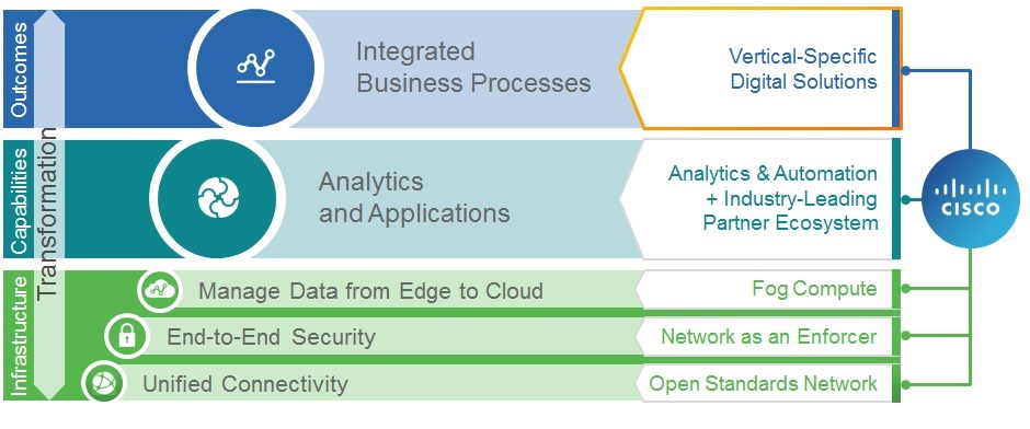 - Outcomes: Customers need to focus on the business outcomes that technology provides rather than on the components that make up the solution. Cisco has integrated all of the elements into Digital Solutions and developed connected services to help our customers throughout the digital journey.