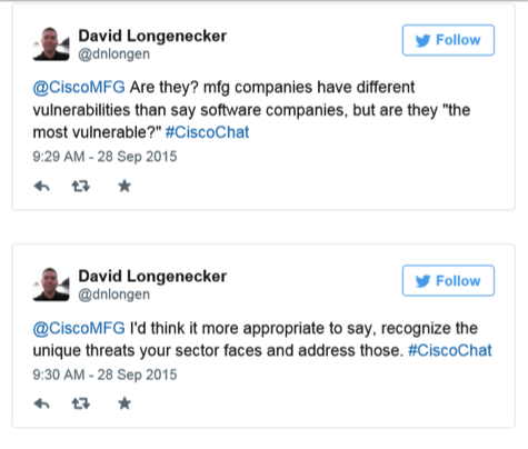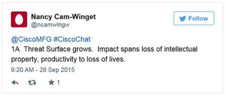Earlier this week, I hosted a #CiscoChat along with other team members of the @CiscoMFG team including Nancy Cam-Winget (@ncamwingw), an industrial security expert and Distinguished Engineer at Cisco, along with cohost Gregory Wilcox (@gswilcox_ohio) of our strategic alliance partner Rockwell Automation (@ROKAutomation). We had a thought-provoking interchange on how new digital business models impact industrial security interests, as well as some of the other inherent security risks for manufacturers.