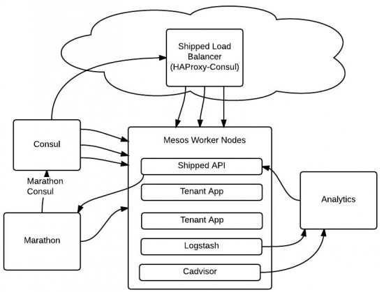 Shipped actually runs itself alongside other tenant applications on Mesos workers. Shipped allows developers to build their application into a docker image. Once you have a containerized app, you can deploy with the push of a button. Behind the scenes, this goes something like this: